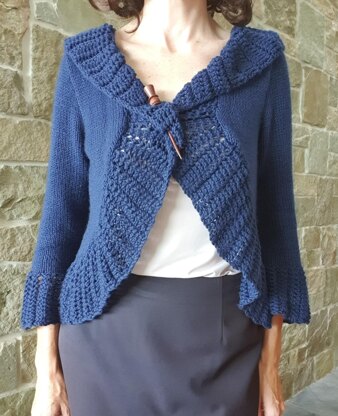 Lady’s 8ply jacket with ¾ sleeves, curved fronts and lace trim knitted on larger needles.