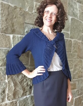 This ladies, plus sizes, 8ply jacket has ¾ length sleeves, curved fronts and a lace trim which is knitted on larger needles.