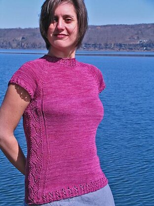 Janet Leigh is a fitted seamless shell with lacy ribbing at the hem and neckline, waist shaping, raglan cap sleeves and a shell lace panel traveling up each side. The lace pattern is interesting enough to keep you from getting bored while you whip up the body, and the top gets done in no time at all. The lace on the sides is solid enough that your under”wear” won’t show too much, but airy enough to keep you cool on a hot day.