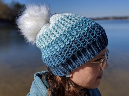Januar is a squishy cozy fun hat with just the right amount of slouch. Working in the round from the bottom up, 5 colors of aran weight yarn are used to create an ombre effect while the moss brioche creates a thicker stretchy fabric.