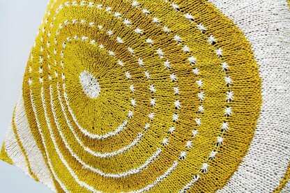 Zen-like concentric circles radiate out from the centre of this lovely shawl, which is visually stunning and surprisingly simple and meditative to knit. Begin by knitting the central circle in the round. The curved wings are then attached, the alternating stripes adorned by short row flowers. The yarn is BC Garn’s Soft Silk, a bourette silk with a beautiful texture.