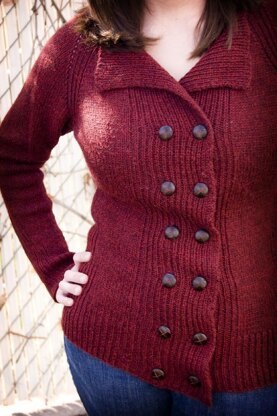 The Jaquetta Cardigan is a play on a traditional double-breasted pea coat—worked top-down in one piece and requiring no seaming. Ribbing is worked along the front lapel/collar, and along the hems and cuffs. Stepped ribbing is worked along the side “seams" to produce custom waist shaping. Simple yet classic!