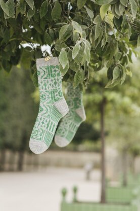 Create your own carefully planned, French garden with these stranded colorwork socks, filled with geometry, symmetry, and perspective. Colorwork provided in charted format only.