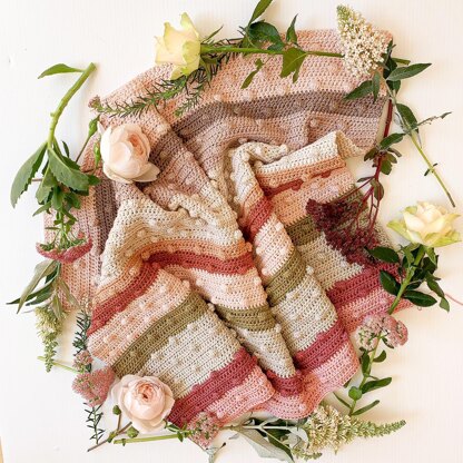 Beautiful modern crochet baby blanket using bobble stitch detailing in two sizes (Baby and Toddler) and four striking colourways (Autumn, Ocean, Woodland and Cottage Gardens).