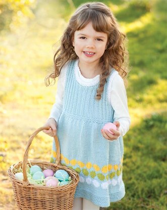 Simple stitches combine to give an interesting look to the dress. The yoke is 1 x 2 ribbing, while the deep garter stitch border at the hem adds interest. It is knit in the round, bottom up, and needs no sewing. Choose the colors you like and mix it up!