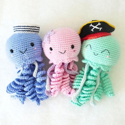 Use this crochet Jellyfish Amigurumi to make cute baby mobiles, or baby rattle toys, etc. Or gift a jellyfish to a friend who loves the Ocean and sea creatures! You can embellish your jellyfish with a star appliqué, with a sailor hat, or with a pirate hat.