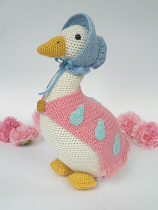 The pattern uses a 3.5mm and 3mm hook with the resulting duck standing 12.5 inches or 32 cm tall (Excl. bonnet).