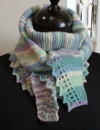 I have designed this small shawl to knit for yourself or to make a quick gift for a friend. It is a simple shawl design which is a variation of the well known Bactus pattern. The body is worked only in knit stitches while the simple lace border is knitted on as you work the main shawl. It starts with a small number of stitches and increases steadily for half of the length. The second half mirrors the first. The pattern works best with a variegated yarn which has short colour changes or an almost solid colourway. If you have a sock yarn with longer colour changes you can easily knit the pattern using both ends of the same ball of yarn.