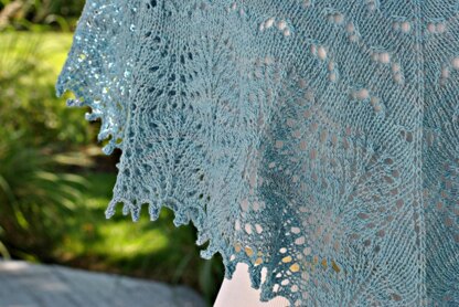 Jenara is a top down shawl worked in four sections. The shawl starts with stockinette stitch then moves into a simple eyelet lace on a stockinette background. The bottom edge features a modified feather and fan lace pattern and has a delicate picot edge.
