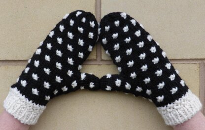 Named after my much missed greyhound, Jen, with her jet black coat covered with random white spots. One skein of each colour of the recommended yarn is ample for two pairs of mittens - you could make one pair as dalmatians.