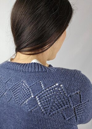 Jensen Cardigan is a classic cardigan elevated by a geometric lace section extending from shoulder to shoulder across the back, and lace eyelets decorating the long v-neckline. Cardigan features a modern fit with positive ease in the body and slim-fit sleeves. Pattern includes chart and written instructions.