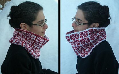 Adapting one of the background designs I found into knitting gave me a great motif, and this cowl is the end result. It uses the double knitting technique to make an accessory which is not only reversible, but double-thick; sure to keep you warm even on a freezing day!