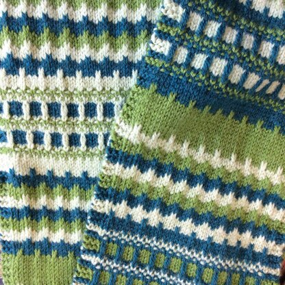 This scarf is worked in blocks of patterns that change colour order to give a varied and interesting effect. The given size is 20.5cm x 232cm, but the length can be altered by removing or adding blocks (approx. 30cm long each).