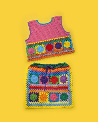 The Join-the-dots Summer Set comes in 3 styles with additional style options to extend. The pattern gives you instructions on how to create a crop top and how to extend this through to a vest or a dress. The pattern also includes how to use the same Dot motifs to create a matching skirt for a full 2 piece set!