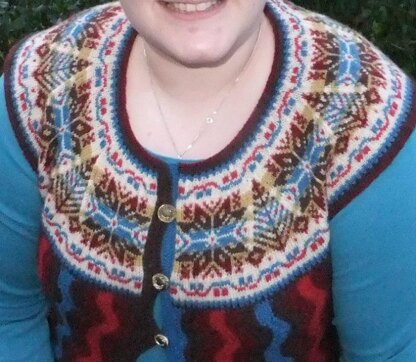 Stitches for the yoke are picked from the edges of the body; a ’steek’ is used so the yoke is knitted in the round. In the Fair Isle yoke only two colours are used in each round.