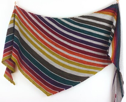 Joplin uses six gradient skeins (Miss Babs Gradient in Yummy 2-Ply Toes in Gemstone) coupled with a main color (Miss Babs Yummy 2-Ply in Fleur de Sel). However, the shawl can be easily altered to accommodate other yarns. A discussion of yardages and the use of five-gradient sets is included in the pattern.