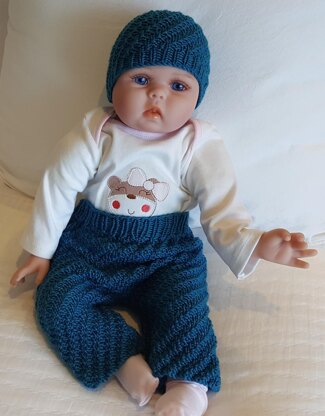 This Beanie and Pants set is worked in diagonal rib and is suitable for a baby girl or boy. The beanie features a standard rib brim and the pants have a rib waistband.