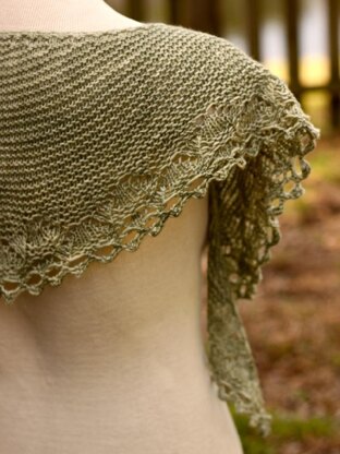 It blocks out to a sweet shoulder shawl that utilizes short-row garter shaping and a bit of lovely lace with an eyelet picot edging.