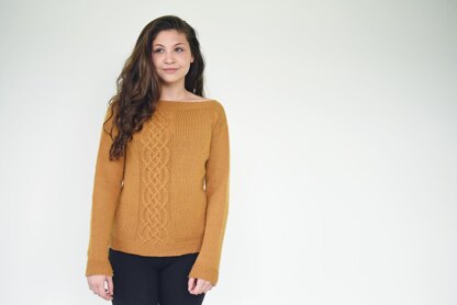 This sweater features an intricate cable panel on the left side of it and has nice textured edges in seed stitch. Worked mostly in Stockinette St, this beauty is quick and easy to knit, and it's all worked in the round.