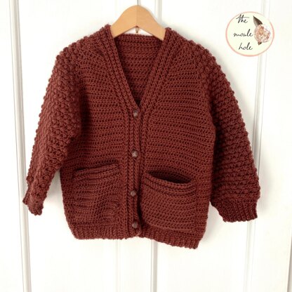 This is a super cozy, oversized crochet cardigan for boys or girls. The beautiful textured sleeves give the cardigan a really special look.
