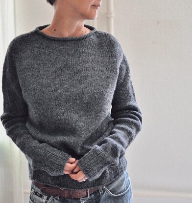 JUiST is worked seamlessly from the top down in stockinette stitch. You start shaping the neck with some short rows, while increasing for a slanted contiguous shoulder. Then you first increase for the sleeves and then also for the back and the front along the markers down to sleeve separation. The sleeve stitches are then placed on hold, underarm stitches are cast on, and you continue to knit the body to the bottom ribbing. After the body is completed, sleeve stitches are placed back onto the needles to knit top down to the cuffs.