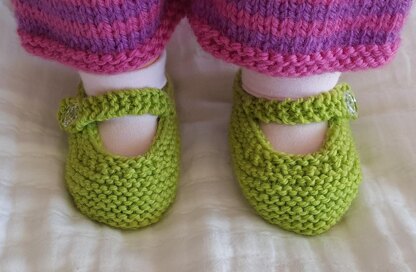 These super cute Mary Jane style baby shoes are knitted in garter stitch and have a buttoned foot strap.