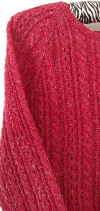 Knit from the top down with raglan sleeves and no seams. This is a 14-stitch repeating pattern that is both cable and lace. The yarn is perfect for this intricate detail. Also, the yarn is made from recycled materials and is available in 20 great colors. Techniques used are: cable, YO, knit or purl through back loop.
