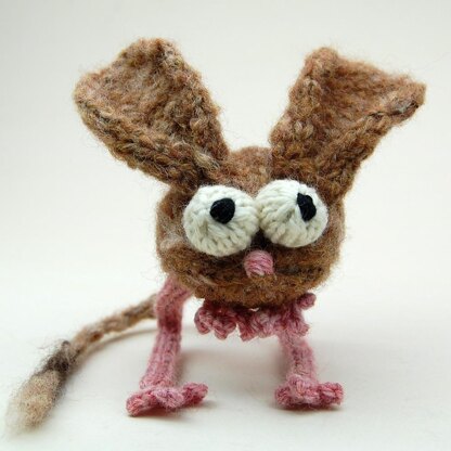Jumpy Jerboa's body & eyes are knit in the round. The ears & paws are knit flat, & the I-cord legs have pipe cleaners in them for extra spring. The example is knit with various worsted weight (8 or 10 ply) wool yarns on US size 3 (3.25 mm) needles, but almost any yarn could be used. Jerboa is approximately 4 inches to the top of the ears, but the finished measurements will be affected by choice of yarn and needle size. This is an intermediate/advanced pattern with plenty of instructional photos & helpful links, & cheezombie is available for help via email as always.