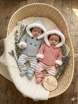 This knitting pattern provides the instructions to make this beautiful fur hooded double breasted modern jacket, pants, bobble hat and booties. The hooded jacket is knitted from the top down on straight needles. The pattern provides easy step by step instructions.