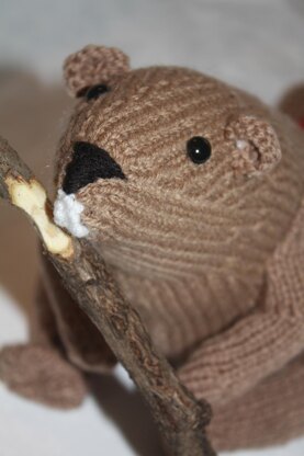 He is knit in one piece from the derriere to the head. His limbs are added later. He is worked in dk yarn.