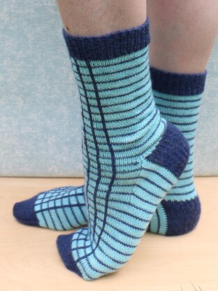 The socks are knitted from the cuff down, starting with a 1 x 1 ribbed cuff. The horizontal stripes are created as the sock is knitted, with purl columns. Once you’ve finished knitting the sock, you use surface crochet or embroidery to add the vertical stripes. If you prefer, you can add the vertical stripes as you knit using basic intarsia.