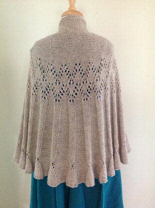 This is a large cosy shawl using stocking stitch and reversed stocking stitch, fluted at the bottom edge, rising to an eyelet pattern towards the top, like the spray off a fountain. There is some shoulder shaping to make the shawl a better fit.