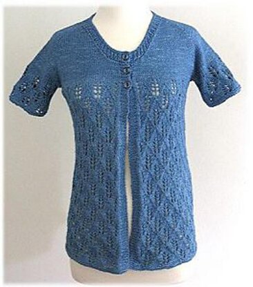 This is a short sleeve cardigan with open front and a raglan shape. It has a wide round neckline. The body of the top is worked in a beautiful lace pattern that is followed on the sleeves too. When the body is joined with the sleeves, the yoke area is worked in Stockinette stitch creating a beautiful line at the armholes until the neck. A set of three beautiful buttons is used for closure that adds to the beauty of the design.