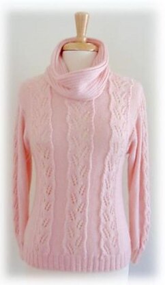 This is a simple knit sweater with a beautiful wheat pattern repeated three times in front and once on the sleeves. It has a cowl neck which is attached after it is knit separately.