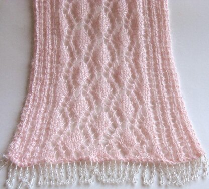 This is a gorgeous scarf worked in two different lace patterns. To make the right and left edge patterns to match, there is a slight difference between the two. To add to the beauty of the scarf and avoid the scruffiness of the fringe after washing, I have used beaded fringe instead of adding regular fringe.