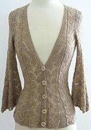 This is a beautiful fitted cardigan worked in lace weight yarn. The pattern is a gorgeous lace pattern that is manipulated to be separated at the bottom edge to create a bit of flare then decreased to make a nice waistline. The ¾ length sleeves follow the same flare of the bottom edge which makes ruffled edge sleeves.