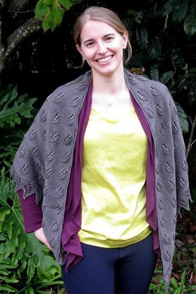 This beautiful triangular shawl begins at the center of back neck with charming embossed leaves pattern all over the shawl. When the shawl is the desired length a gorgeous leaves edging finishes the shawl. The veins of the leaves and points of the leaves on the edging of the shawl are all decorated with glass beads.