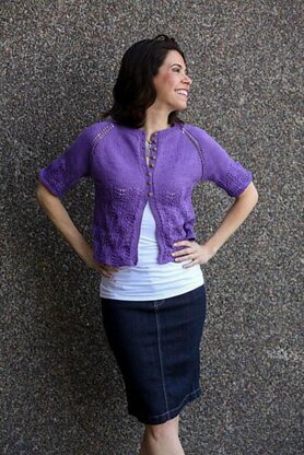 This beautiful raglan cardigan is worked from the top down and features a lacy Ostrich Plumes stitch pattern. Dazzling gold buttons line the front of this sweater that dresses up any simple tank and tee outfit.