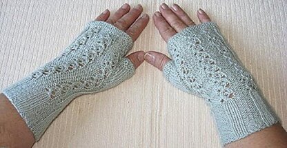 This is a gorgeous pattern worked in a wonderful yarn. The pattern is very delicate and feminine. The beads add to the beauty of the design. The gauntlets are worked from the wrist to the fingers. The same pattern that is on the back of the hand is used for the cowl.