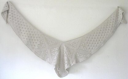This beautiful shawlette starts with three blocks worked from center out that are joined in a triangular shape. This shape helps to keep the shawlette on shoulders. Stitches are picked up on two sides creating the wingspan. The sides are decreased as the work progresses to make the pointed edge. The inside edge of the shawlette is finished with applied I-cord and the outside is decorated with a narrow edging. Since the I-cord is a tighter knit, the inside edge is pulled in to create a crescent shape to the shawlette.