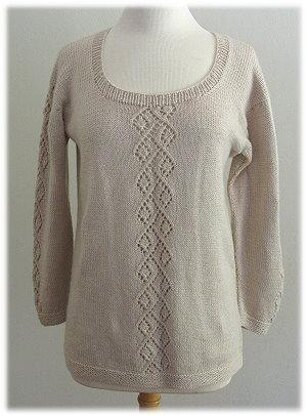This gorgeous top is worked top down with a round neckline and modified drop shoulders. The lace panel in front is repeated on the long sleeves.