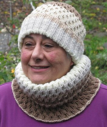 This is a beautiful set of hat and cowl worked in an easy cable pattern that creates a reversible honeycomb look. The pattern is easy to work. The top of the hat is finished with an I-cord loop.