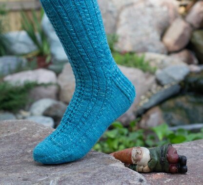 Simple cables and rib are combined to create a great fitting sock, while the unusual lace stitch running down the front and back add a bit of flair.