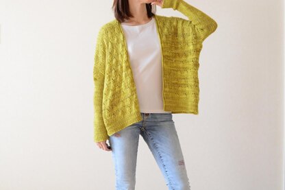 It is worked from the top down seamlessly. The fronts and back are first worked back and forth separately. After short-row shoulder shaping, they are worked in Kaga pattern to the underarm, then joined. The lower body is knitted in one piece to the hem.