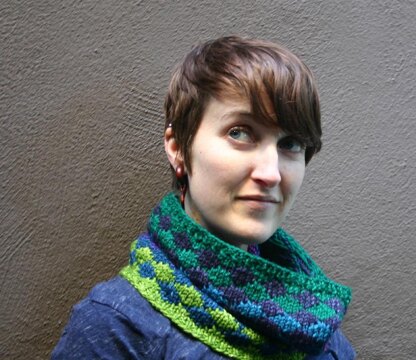 Play with a colorful palette while making this quick and fun cowl. Each color mixes with the one above and below for an ever-changing interplay of hues. The easy slip-stitch pattern works best with a mix of dark and lighter/brighter yarns, or choose one solid and one variegated for the two-color version.