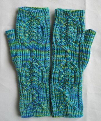 This is a pattern for fingerless mitts. They measure approximately 4- 5 inches from your thumb up your arm. They feature cable stitch patterns on both sides of the mitts, with a ribbing center for shaping. The stitches are Charted only. The mitts also have a thumb gusset to ensure the best fit, and allow you to type, text or knit and keep warm at the same time. One size fits most, as a result of the lateral give, but there are tips for changing the size within each pattern. These mitts are made using two circular needles, and a heavy weight sock yarn.