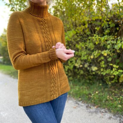 Kara Pullover is a classic turtleneck pullover with a cable panel at the center front. The pullover is worked top down in one piece – first in rows, and after completing the front neck shaping completely in the round. Short rows are worked for back neck shaping. The shoulders and sleeve caps are worked using the contiguous sleeve method developed by Susie Myers.