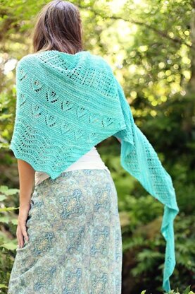This boomerang-shaped shawl is knit from the top (neck) edge down. Due to the unique shaping, the lace motifs of this shawl appear in a gently diagonal orientation. The pattern requires between 750 and 775 yards of light fingering weight yarn. If you choose to substitute yarns, choose one with a good drape to show off the lace motifs to their fullest. While gauge is not critical for this project, it will affect the amount of yarn you need to complete it as written if your gauge is different than that indicated.