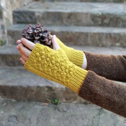 These mitts are knitted out of beautiful natural yarn — Ulysse by De Rerum Natura. The pattern features an elegant textured pattern that combines lace and bobbles.