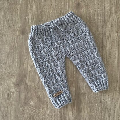 KASEY CROCHET BABY PANTS PATTERN PDF - Cute textured baby joggers | baby leggings in 6 sizes from Newborn to 2 Years. Made seamless all in one so no sewing :) Unisex | Gender Neutral - Baby Boy or Baby Girl.